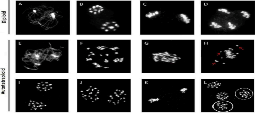 減數(shù)分裂過程中染色體行為分析結(jié)果顯示:二倍體中,同源染色體中期配對(duì)為二倍體,后期分離(圖1A-D)。四倍體中,在減數(shù)分裂中期I形成多倍體和單倍體,在后期I、II發(fā)生不均等分離(圖1E-L)。