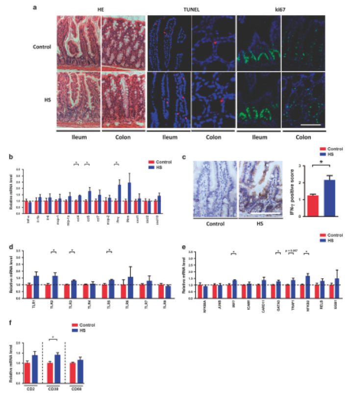 腸道生態(tài)失調(diào)通常與腸道病理生理學(xué)的改變有關(guān),研究人員檢查了慢性HS喂養(yǎng)對腸道變化的影響。在對照組和HS-喂養(yǎng)組小鼠的回腸和結(jié)腸上皮細胞形態(tài)沒有差異(圖3a)。此外,通過TUNEL和ki67染色鑒定的相似數(shù)量凋亡和增殖細胞表明,慢性HS喂養(yǎng)不影響腸道中的細胞死亡(圖3a)。然而,研究人員發(fā)現(xiàn)炎癥標志物表達被慢性HS攝入顯著改變。特別是,Ccl4,Ccl5和Ifn-γ在HS小鼠的回腸中表現(xiàn)出更高的mRNA水平(圖3b)。 IFN-γ免疫組織化學(xué)在回腸中的結(jié)果證實了基因表達數(shù)據(jù)(圖3c)。由于TLR家族蛋白和Nf-κB是參與病原體相關(guān)免疫應(yīng)答的主要分子,進一步評估TLR家族和Nf-κB基因表達,發(fā)現(xiàn)TLR2,TLR3和TLR5mRNA水平在回腸中趨于更高(圖3d)。同時,HS處理后IRF7,GATA3和NFKB2的表達顯著上調(diào)(圖3e)。此外,HS喂養(yǎng)后白細胞中CD38的表達在回腸中升高(圖3f)。然后通過RNA測序進行轉(zhuǎn)錄組分析,并比較涉及“細胞因子 – 細胞因子受體相互作用”,“ NF-κB信號通路“和”Toll樣受體信號通路“。在回腸和結(jié)腸中,兩組之間許多基因的表達是不同的??偟膩碚f,這些數(shù)據(jù)表明慢性HS攝入導(dǎo)致腸炎癥反應(yīng)中斷。