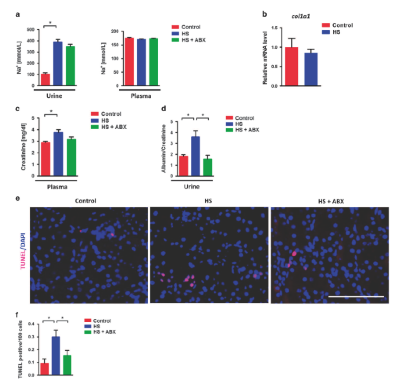 為了進一步闡明HS攝入后腸道生態(tài)失調(diào)和腎損傷之間的關(guān)系,給小鼠喂養(yǎng)多粘菌素B和新霉素。抗生素給藥確實恢復(fù)了HS飼喂誘導(dǎo)的回腸Ifn-γ過表達,通過糞便白蛋白和FD-4滲透監(jiān)測腸道泄漏,以及通過血漿內(nèi)毒素水平和腎臟16s / 18s比率監(jiān)測的細菌移位,通過尿和血漿Na +濃度測量,抗生素不改變鈉負荷(圖5a)。雖然8周HS喂養(yǎng)并未引起纖維化等進展性腎損傷,但由col1a1 mRNA水平監(jiān)測(圖5b),HS喂養(yǎng)增加了血漿肌酐水平。更重要的是,與對照組小鼠相比,HS-喂養(yǎng)小鼠腎功能障礙的主要標志物尿白蛋白/肌酐比率顯著增加,抗生素治療幾乎可以完全恢復(fù)腎功能(圖5d)。另外,TUNEL染色顯示抗生素施用可以降低HS誘導(dǎo)的凋亡細胞的升高(圖5e和f)。總之,該數(shù)據(jù)表明,抗生素治療能夠改善腸道滲漏和HS喂養(yǎng)引起的早期腎損傷。