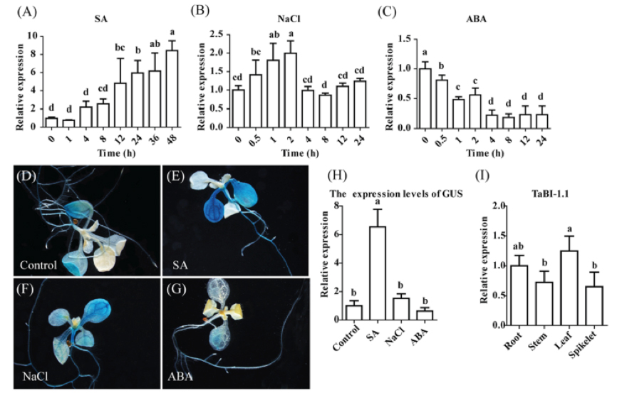 研究者創(chuàng)建了含有1.7kb TaBI-1.1啟動子并生成轉(zhuǎn)基因擬南芥的PBI :: GUS融合構(gòu)建體,以研究TaBI-1.1的空間表達模式。使用GUS染色測定組織GUS活性。在成熟葉和根中有TaBI-1.1表達,但在下胚軸和幼葉中觀察不到(圖1D)。還檢測了各種小麥組織中的TaBI-1.1表達水平,包括根,莖,葉和小穗,結(jié)果表明TaBI-1.1的表達在這些小麥組織中普遍存在,而且在葉中最高,在小穗中最低(圖1I)。在SA和NaCl處理之后,成熟葉中的表達與對照相比增加,并且SA處理的表達更高。當SA和NaCl處理時,在下胚軸中也檢測到表達(圖1E,F(xiàn))。在ABA處理的植物的葉子中檢測到較弱的表達(圖1G)。通過qRT-PCR進一步證實GUS表達水平(圖1H)。以上結(jié)果表明,TaBI-1.1在各種脅迫下均有表達。