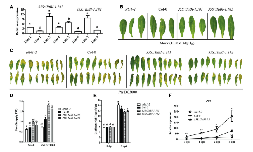 圖2. TaBI-1.1轉(zhuǎn)基因擬南芥對Pst DC3000的抗性增強