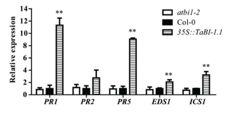 PR基因表達與SA積累和系統(tǒng)獲得性抗性(SAR)有關(guān)。進一步檢測了常規(guī)條件下生長2周齡Col-0,atbi1-2和35S :: TaBI-1.1#1幼苗中SA相關(guān)基因的表達。與Col-0和atbi1-2相比,在35S :: TaBI-1.1中觀察到PR1,PR5,ICS1和EDS1有顯著高表達水平。 然而,在這些基因表達水平中Col-0和atbi1-2之間沒有檢測到顯著差異(圖3)。 與Col-0相比,35S :: TaBI-1.1中PR1和PR5的表達水平分別增加了約11倍和9倍。 PR2,ICS1和EDS1表達的倍數(shù)變化低于PR1和PR5表達的變化(圖3)。因此,TaBI-1.1上調(diào)PR1,PR2,PR5,ICS1和EDS1基因的表達,表明 TaBI-1.1在SA信號傳導(dǎo)中起正向調(diào)節(jié)作用。