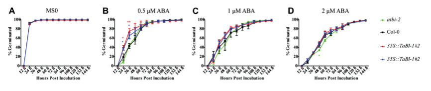 研究者進一步研究了TaBI-1.1在發(fā)芽過程中對ABA的敏感性。 在不同濃度的ABA的培養(yǎng)基上每12小時記錄發(fā)芽種子的百分比。在MS0培養(yǎng)基中,Col-0,atbi1-2和35S :: TaBI-1.1轉(zhuǎn)基因擬南芥植物顯示相似的發(fā)芽率(圖5A)。 含有0.5μMABA的培養(yǎng)基中,兩種轉(zhuǎn)基因株系萌發(fā)顯著快于Col-0和atbi1-2(圖5B)。 在含有1μMABA的培養(yǎng)基上觀察不到顯著差異(圖5C)。 在含有2μMABA的培養(yǎng)基上,Col-0和兩種轉(zhuǎn)基因品系也比atbi1-2稍快地萌發(fā)(圖5D)。 以上結(jié)果表明,TaBI-1.1轉(zhuǎn)基因擬南芥對ABA的敏感性較低。