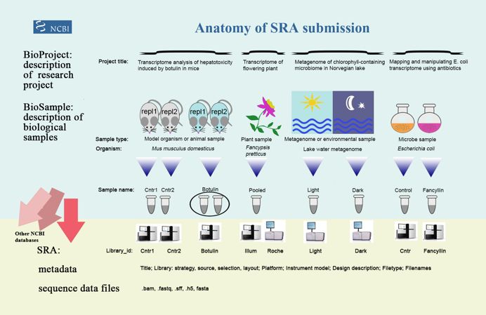 有過數(shù)據(jù)上傳經(jīng)歷的童鞋應(yīng)該對(duì)SRA并不陌生,上傳數(shù)據(jù)前我們一般要?jiǎng)?chuàng)建BioProject、BioSample,用于詳細(xì)說明項(xiàng)目信息、樣品信息;并通過SRA的Experiment、RUN描述建庫測序相關(guān)信息,如建庫類型、測序儀器、單雙端等;下圖概括出了幾者之間的關(guān)系。