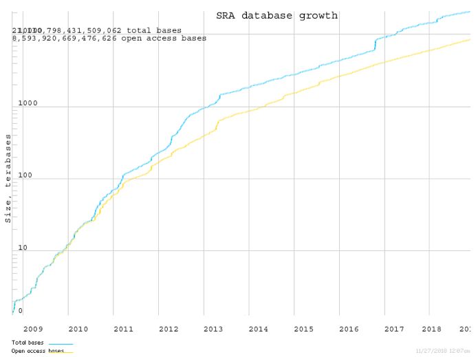SRA數(shù)據(jù)庫中存儲(chǔ)的是高度壓縮后的sra格式數(shù)據(jù),截止到目前,SRA中已經(jīng)累計(jì)存儲(chǔ)了超過20P堿基數(shù)據(jù),而且每年仍在以極快的速度增長。
