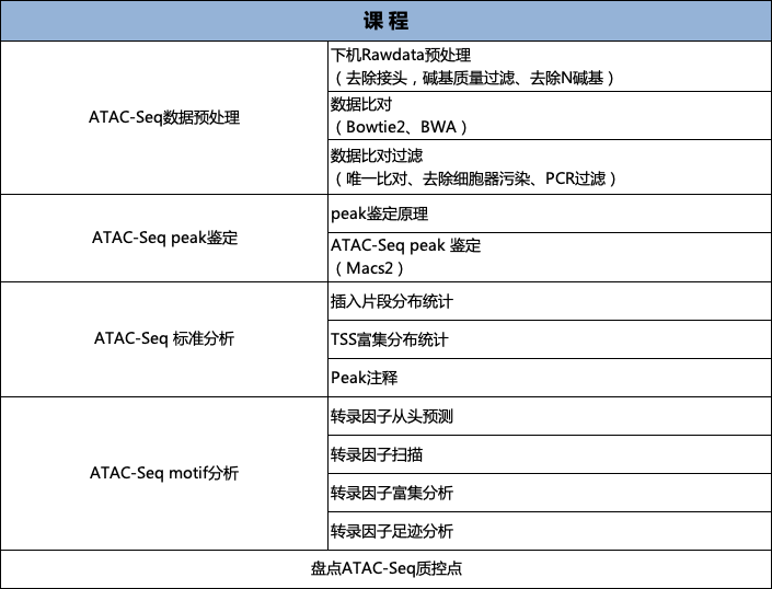 本課程主要從技術(shù)原理、實(shí)驗(yàn)步驟、生物信息學(xué)分析、文獻(xiàn)分享四大內(nèi)容向大家介紹ATAC-Seq技術(shù)。同時,本課程還涉及專門的生物信息學(xué)實(shí)操課程,帶領(lǐng)大家學(xué)習(xí)ATAC-Seq基本分析流程,其中包括數(shù)據(jù)質(zhì)控、Peak Calling、Motif分析等。從而幫助大家將ATAC-Seq運(yùn)用在自己的課題當(dāng)中。